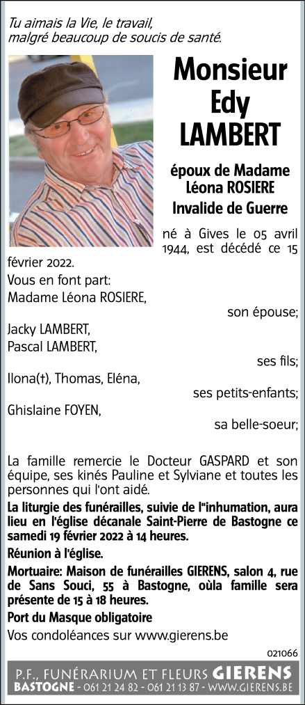 Décédé à Bastogne (6600) le mardi 15 février 2022 à l'âge de 77 ans