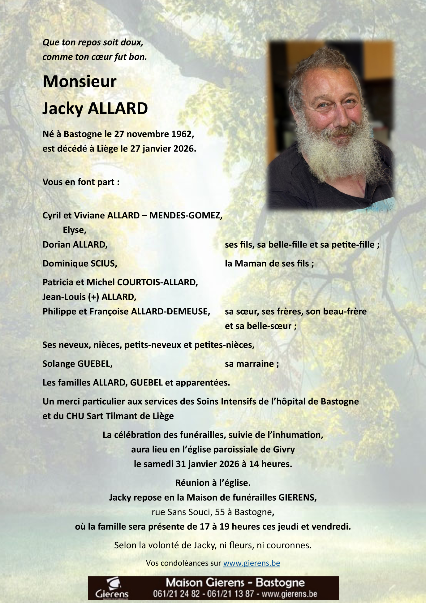 Décédé à Liège (4000) le mardi 27 janvier 2026 à l'âge de 63 ans