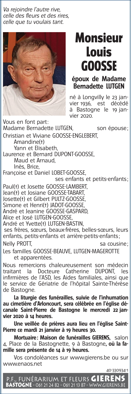 Décédé à Bastogne (6600) le dimanche 19 janvier 2020 à l'âge de 83 ans