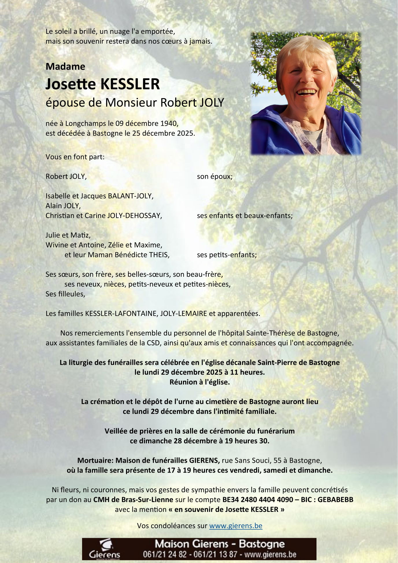 Décédée à Bastogne (6600) le jeudi 25 décembre 2025 à l'âge de 85 ans