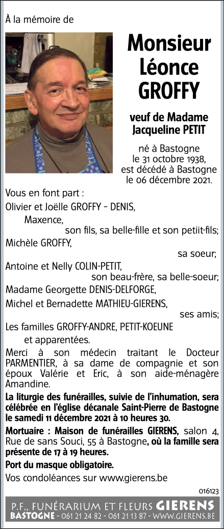 Décédé à Bastogne (6600) le lundi 6 décembre 2021 à l'âge de 83 ans