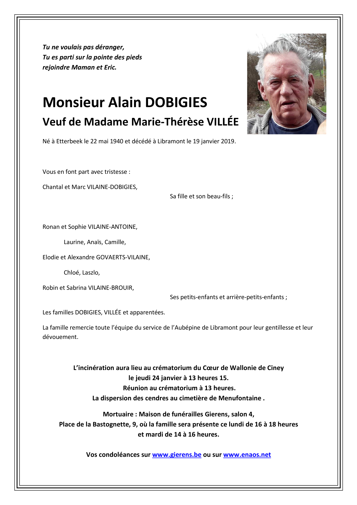 Décédé à Libramont-Chevigny (6800) le samedi 19 janvier 2019 à l'âge de 78 ans