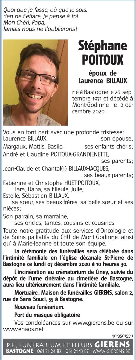 Décédé à Yvoir (5530) le mercredi 2 décembre 2020 à l'âge de 49 ans