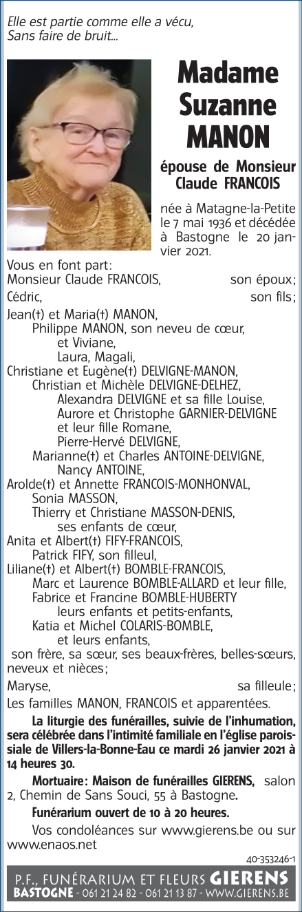 Décédée à Bastogne (6600) le mercredi 20 janvier 2021 à l'âge de 84 ans