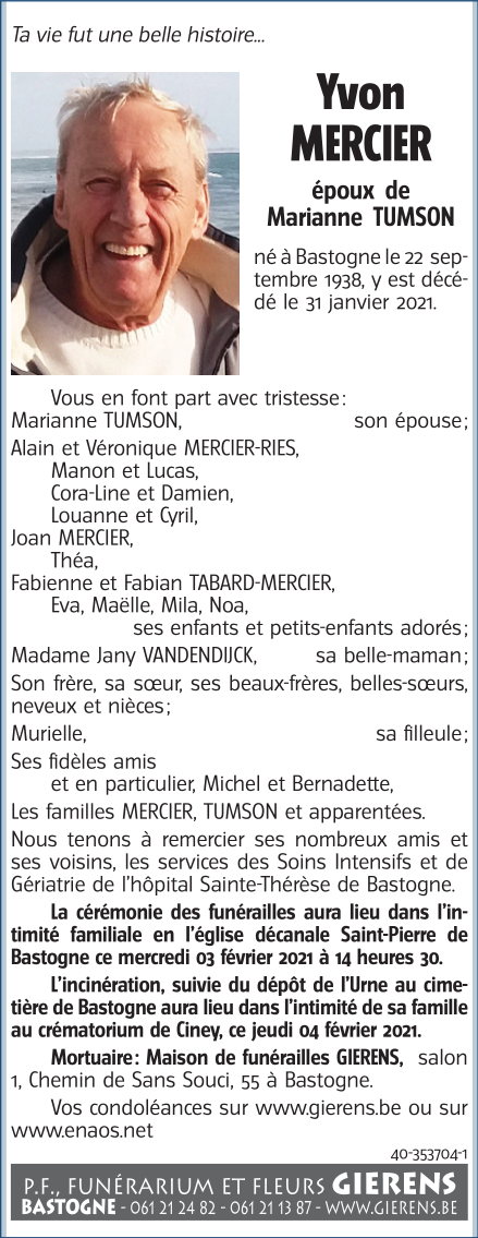 Décédé à Bastogne (6600) le dimanche 31 janvier 2021 à l'âge de 82 ans