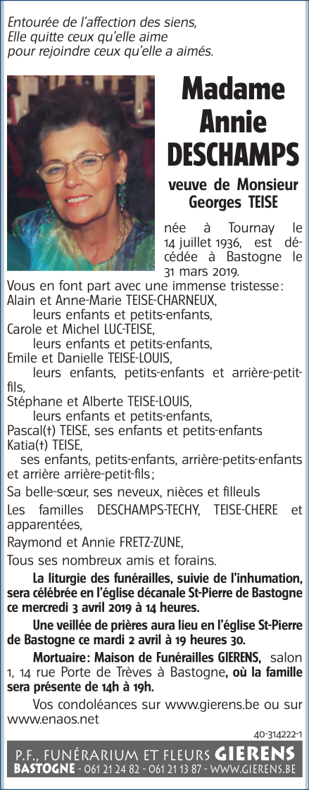 Décédée à Bastogne (6600) le dimanche 31 mars 2019 à l'âge de 82 ans