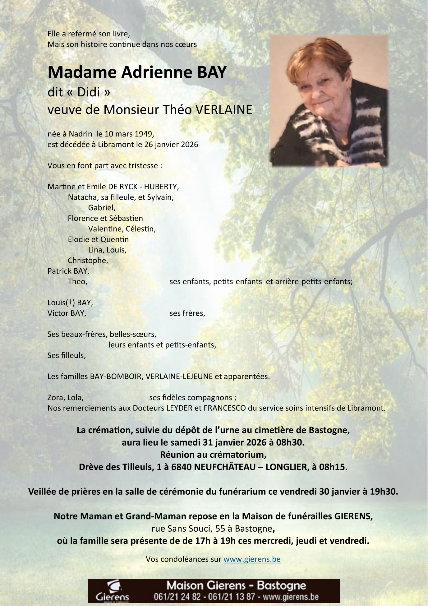 Décédée à Libramont-Chevigny (6800) le lundi 26 janvier 2026 à l'âge de 76 ans