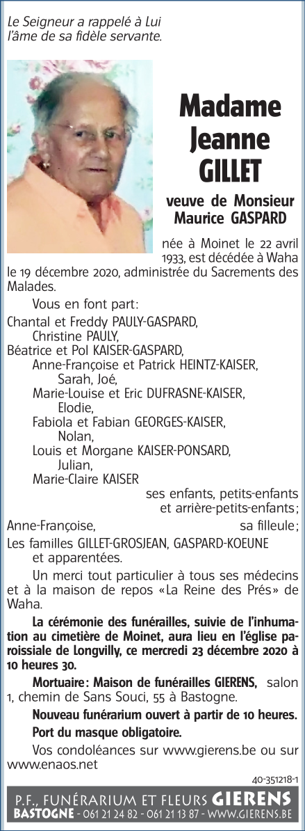 Décédé à Waha (6900) le samedi 19 décembre 2020 à l'âge de 87 ans