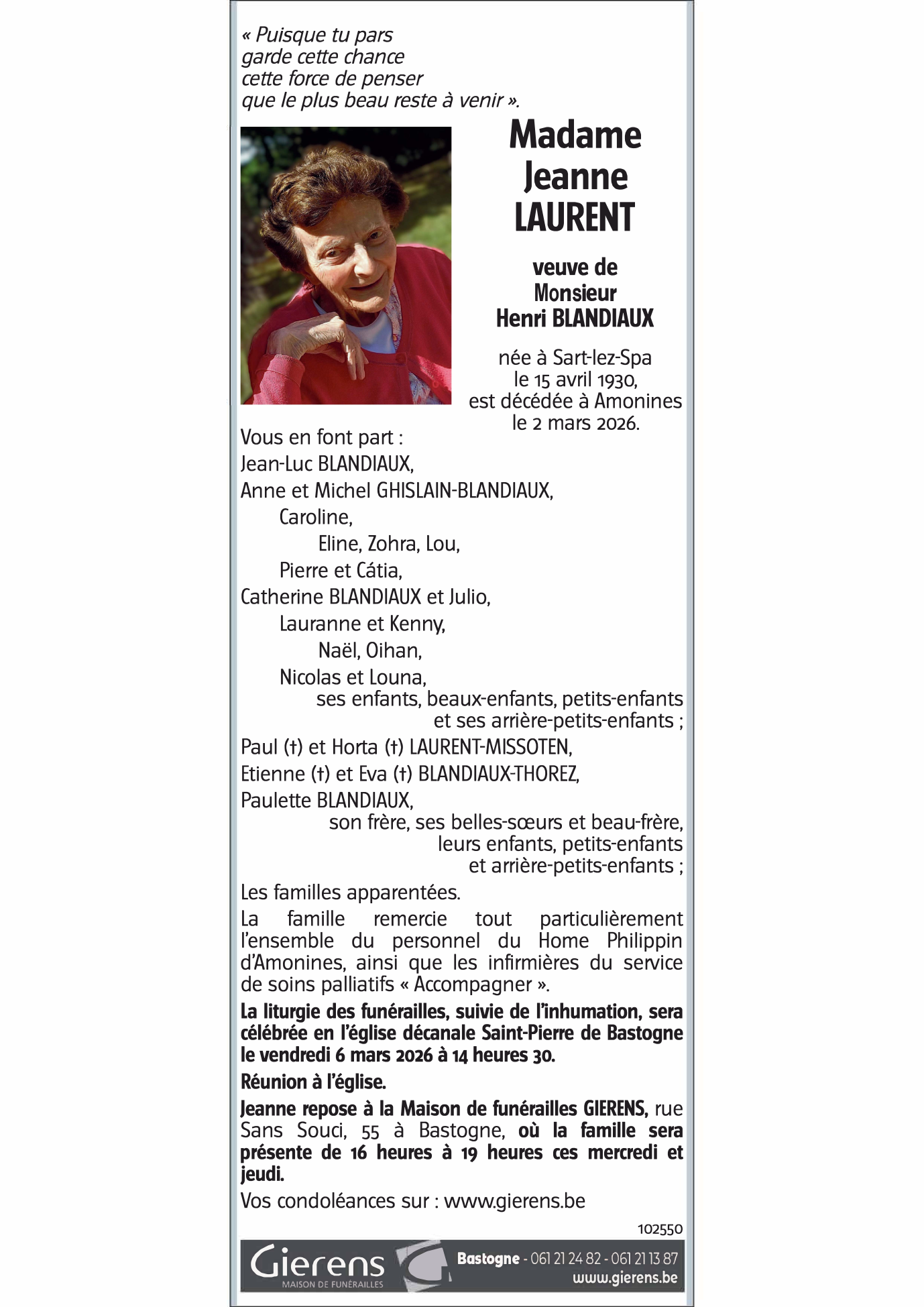 Décédée à Amonines (6997) le lundi 2 mars 2026 à l'âge de 95 ans