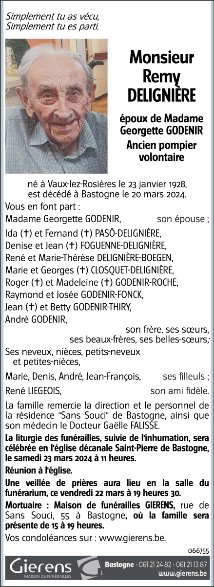 Décédé à Bastogne (6600) le mercredi 20 mars 2024 à l'âge de 96 ans