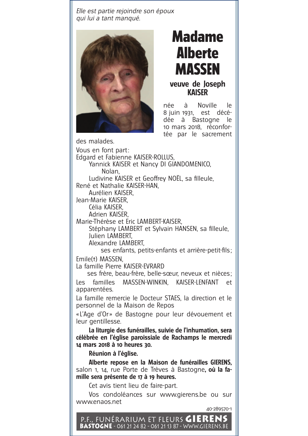 Décédée à Bastogne (6600) le samedi 10 mars 2018 à l'âge de 86 ans