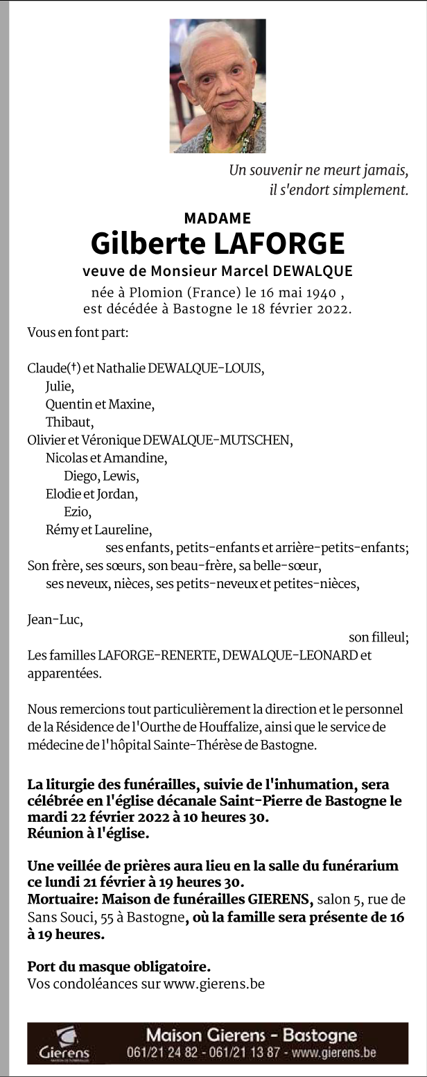 Décédée à Bastogne (6600) le vendredi 18 février 2022 à l'âge de 81 ans