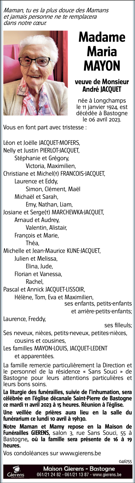Décédée à Bastogne (6600) le jeudi 6 avril 2023 à l'âge de 99 ans