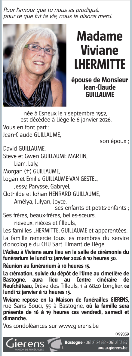 Décédée à Liège (4000) le mardi 6 janvier 2026 à l'âge de 73 ans