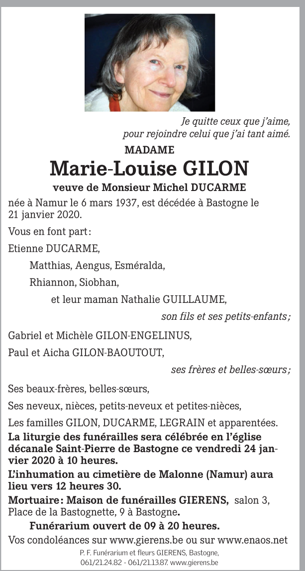 Décédée à Bastogne (6600) le mardi 21 janvier 2020 à l'âge de 82 ans
