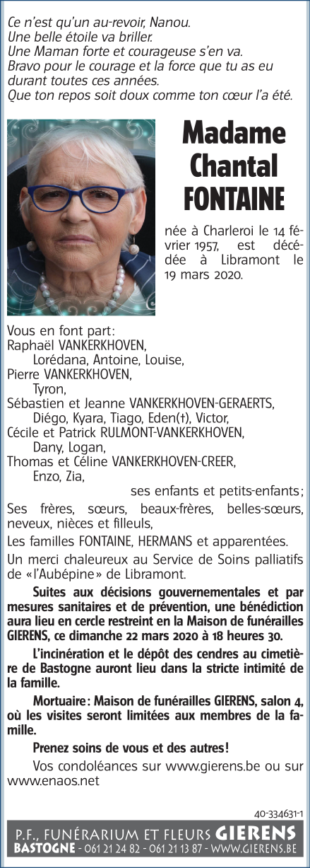 Décédée à Libramont-Chevigny (6800) le jeudi 19 mars 2020 à l'âge de 63 ans