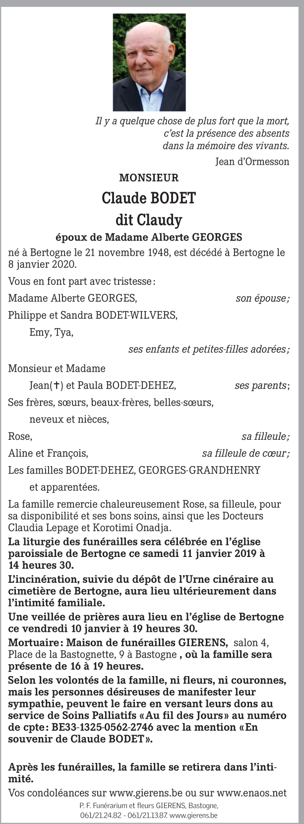 Décédé à Bertogne (6687) le mercredi 8 janvier 2020 à l'âge de 71 ans