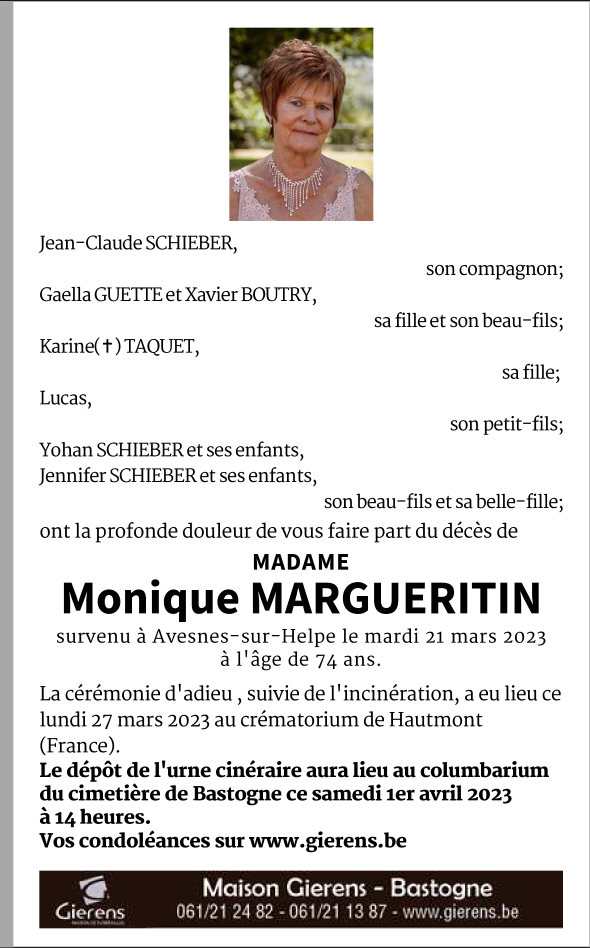 Décédée à Avesnes-sur-Helpe (59440, France) le mardi 21 mars 2023 à l'âge de 74 ans