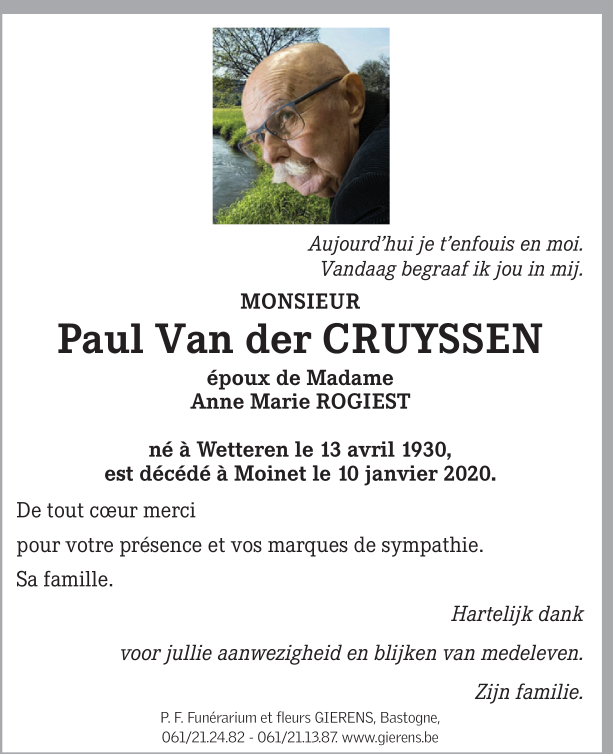 Décédé à Bastogne (6600) le vendredi 10 janvier 2020 à l'âge de 89 ans