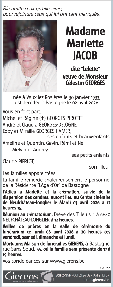 Décédée à Bastogne (6600) le jeudi 2 avril 2026 à l'âge de 93 ans