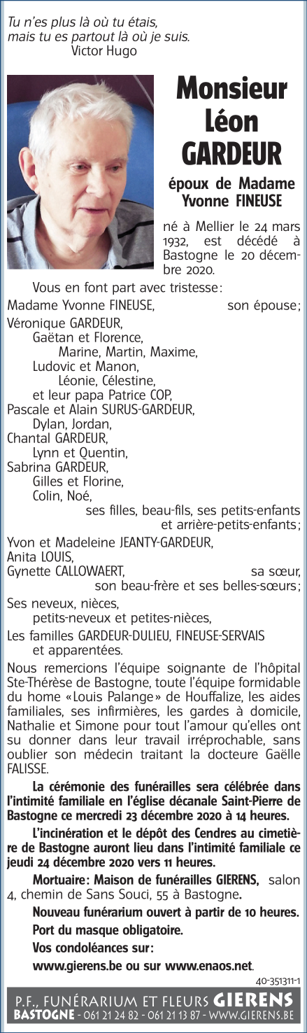 Décédé à Bastogne (6600) le dimanche 20 décembre 2020 à l'âge de 88 ans