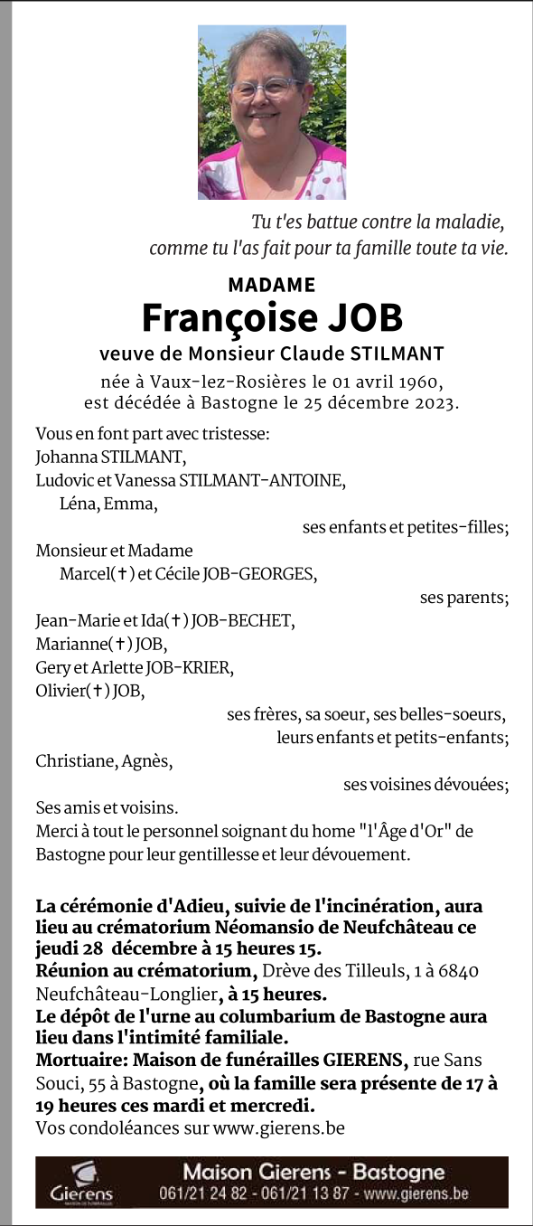 Décédée à Bastogne (6600) le lundi 25 décembre 2023 à l'âge de 63 ans