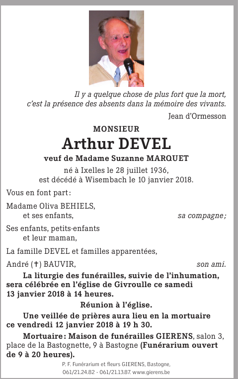 Décédé à Wisembach (6637) le mercredi 10 janvier 2018 à l'âge de 81 ans