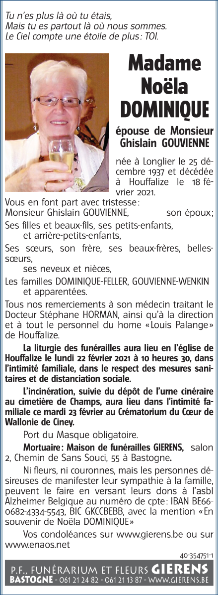 Décédée à Houffalize (6660) le jeudi 18 février 2021 à l'âge de 83 ans