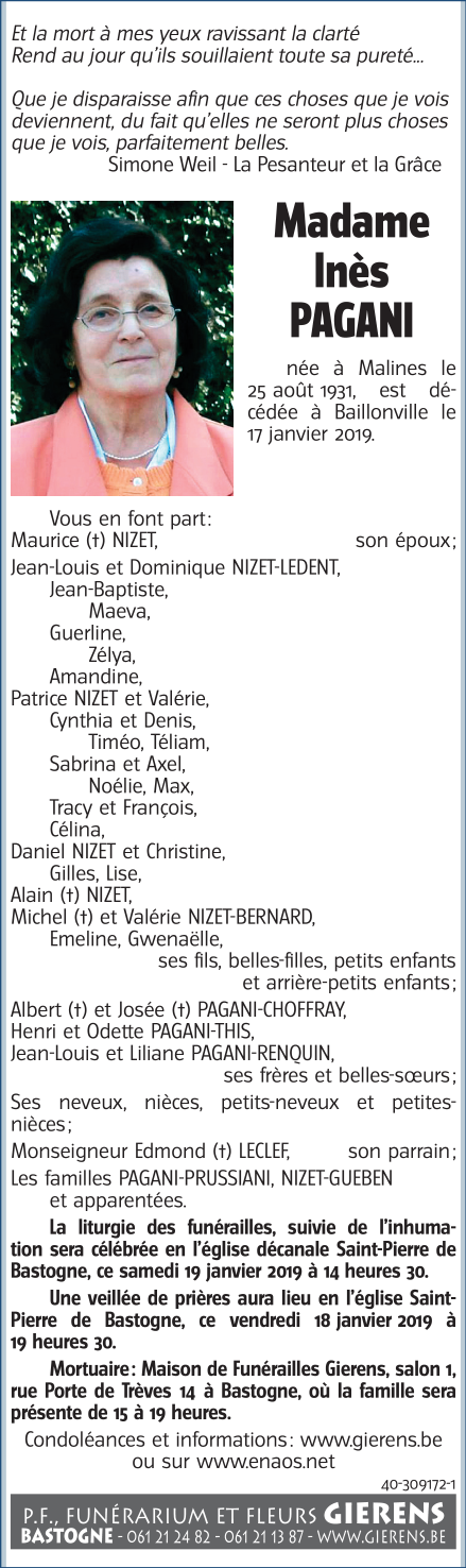 Décédée à Baillonville (5377) le jeudi 17 janvier 2019 à l'âge de 87 ans